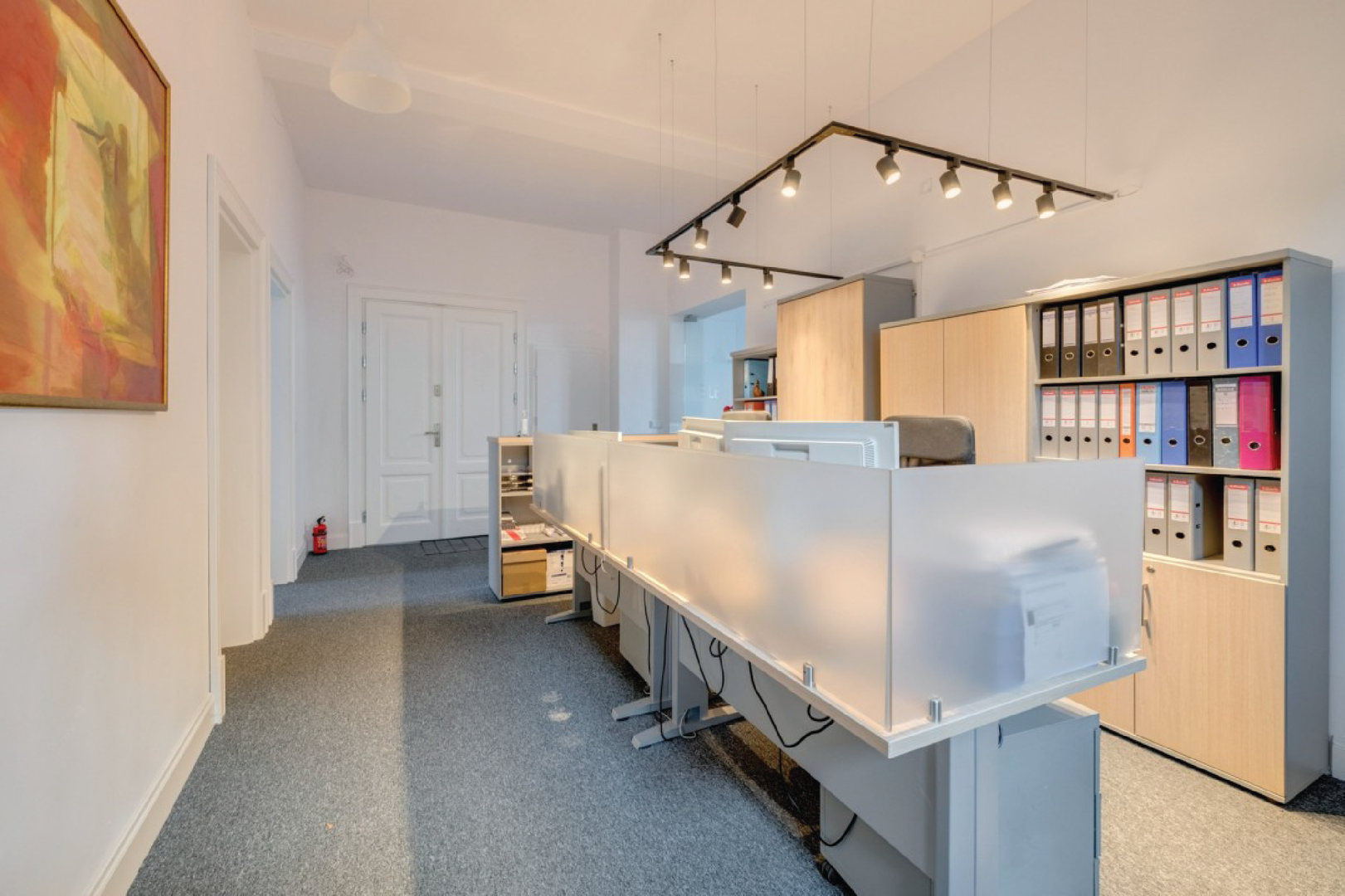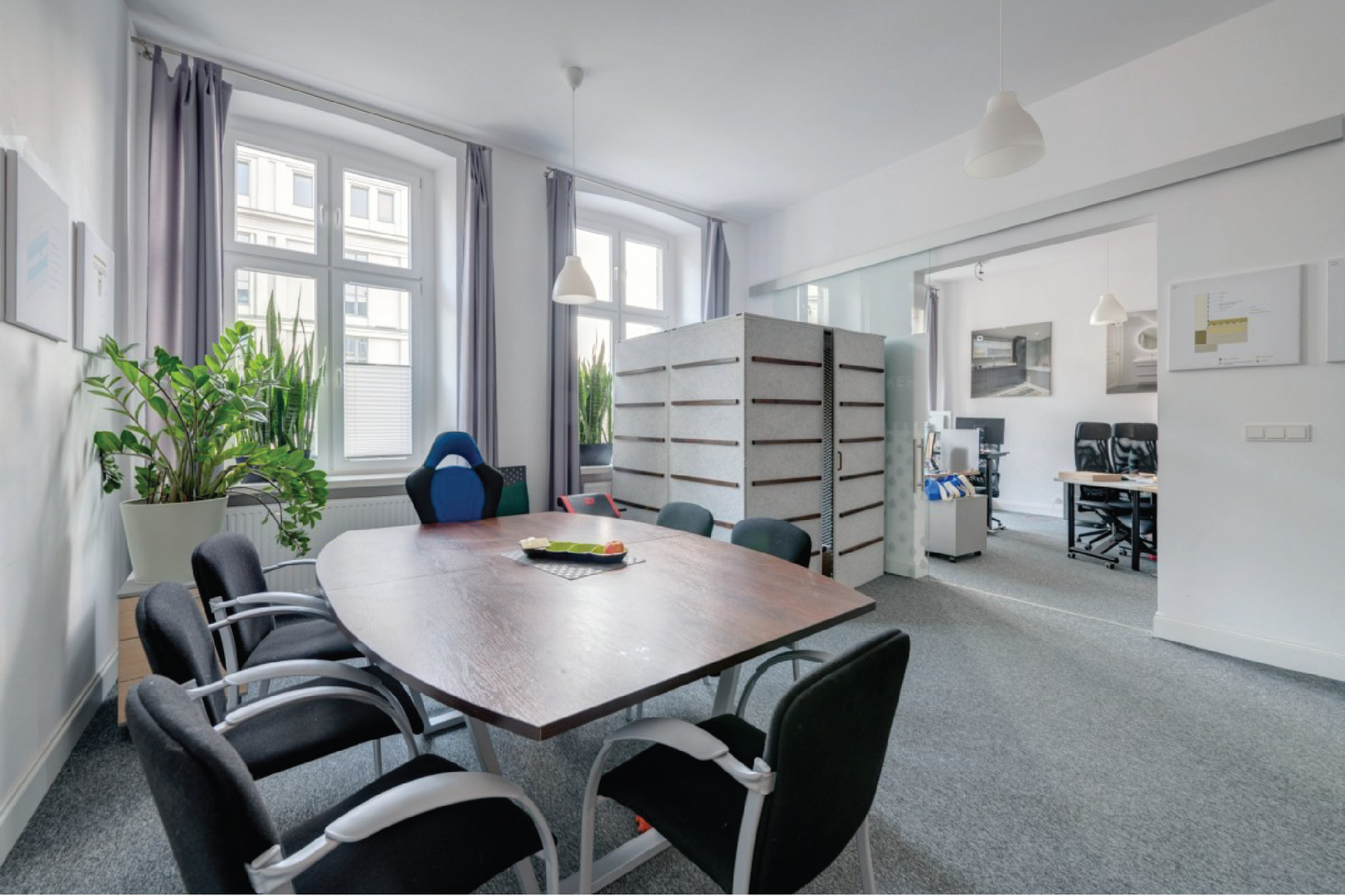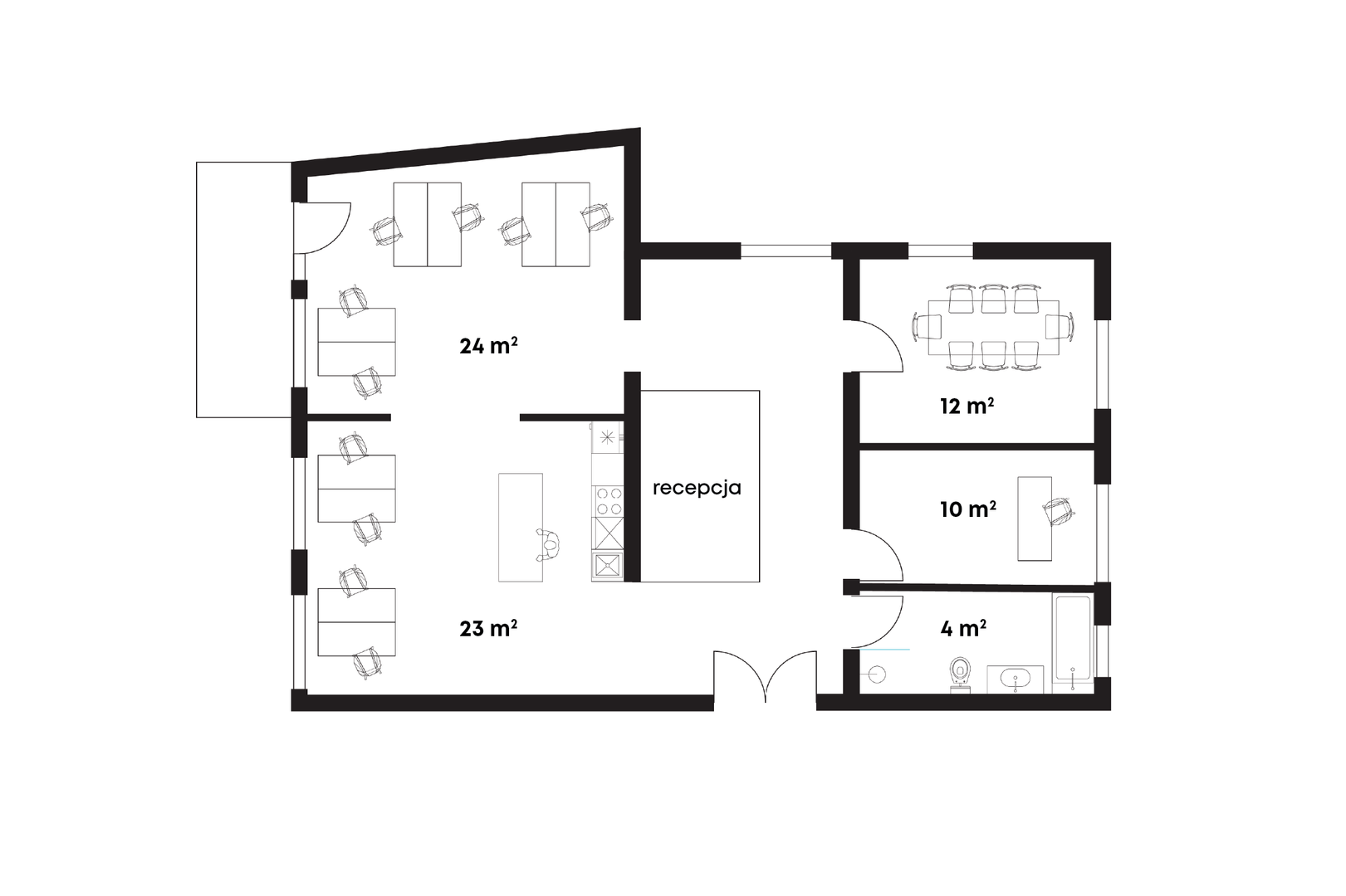 Lokal składa się z przestrzeni openspace na 6 stanowisk, dwóch niezależnych, zamykanych gabinetów, reprezentacyjnej recepcji (poczekalnia), oddzielnej, przestronnej kuchni oraz łazienki z wanną i prysznicem. Okna usytuowane w kierunku wschodu i zachodu.