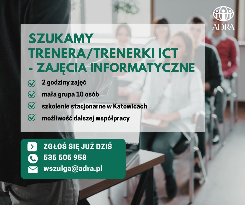 Fundacja ADRA Polska poszukuje osoby do prowadzenia stacjonarnych zajęć informatycznych dla dorosłych w Katowicach.