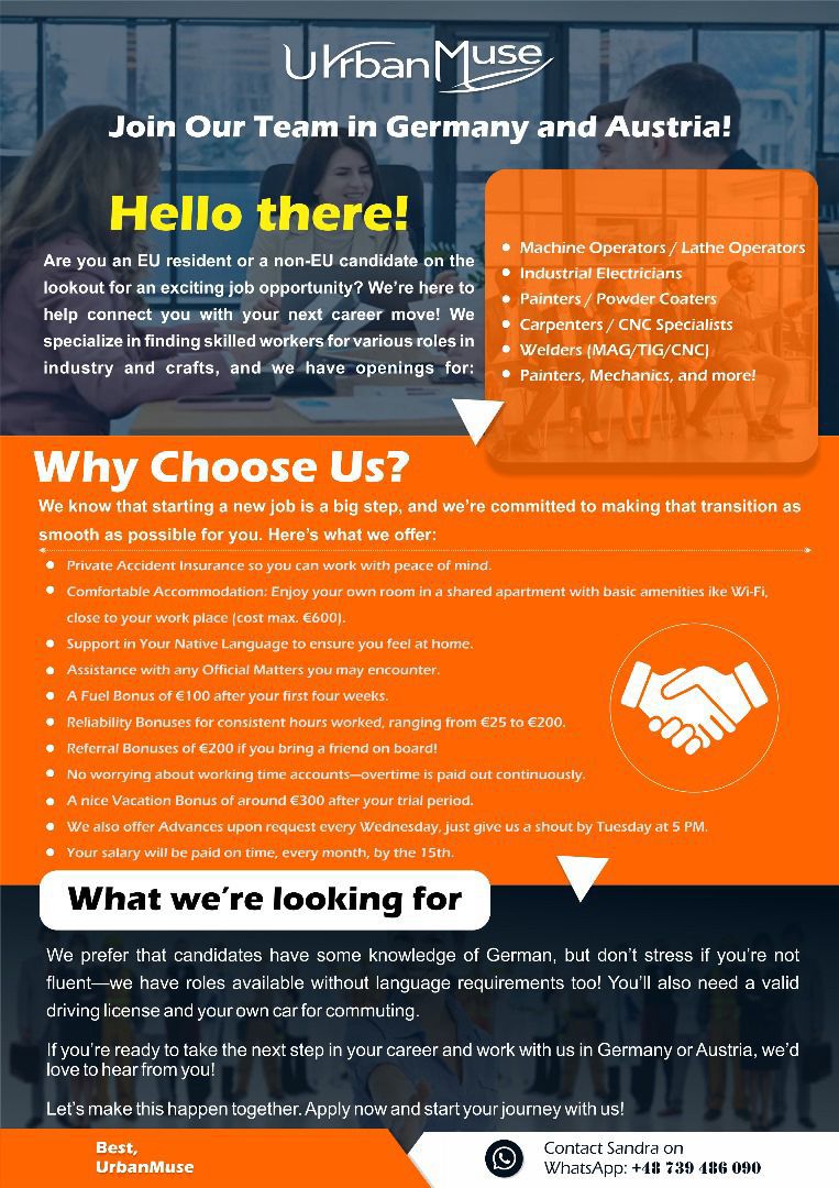 Jesteś rezydentem lub obywatelem UE i szukasz ciekawej pracy? Specjalizujemy się w łączeniu wykwalifikowanych pracowników z satysfakcjonującymi stanowiskami w różnych branżach. Aktualne oferty pracy: - Operatorzy maszyn / Tokarze - Elektrycy przemysłowi - Malarze / Lakiernicy proszkowi - Stolarze / Specjaliści CNC - Spawacze (MAG/TIG/CNC) - Mechanicy i inni! Dlaczego warto do nas dołączyć? - Prywatne ubezpieczenie NNW dla spokoju ducha. - Komfortowe zakwaterowanie: Własny pokój w mieszkaniu współdzielonym (maks. 600 EUR). - Wsparcie w Twoim języku dla płynnej adaptacji. - Pomoc w sprawach urzędowych, która pomoże Ci się zaaklimatyzować. - Bonus paliwowy w wysokości 100 EUR po pierwszym miesiącu. - Bonus za niezawodność: Zarób od 25 do 200 EUR za stałą pracę. - Bonus za polecenie: 200 EUR za przyprowadzenie znajomego! - Brak stresu związanego z kontem czasowym: Nadgodziny wypłacane na bieżąco. - Premia urlopowa w wysokości około 300 euro po okresie próbnym. - Tygodniowe zaliczki na żądanie w każdą środę. - Stałe wypłaty wynagrodzenia do 15. dnia każdego miesiąca. Wymagania: - Podstawowa znajomość języka niemieckiego mile widziana; dostępne stanowiska dla osób nieznających języka niemieckiego. - Ważne prawo jazdy i samochód służbowy wymagane do dojazdów. Chcesz rozwijać swoją karierę w Niemczech lub Austrii? Chętnie Cię poznamy! Aplikuj już teraz! Skontaktuj się z Sandrą przez WhatsApp: +48 739 486 090