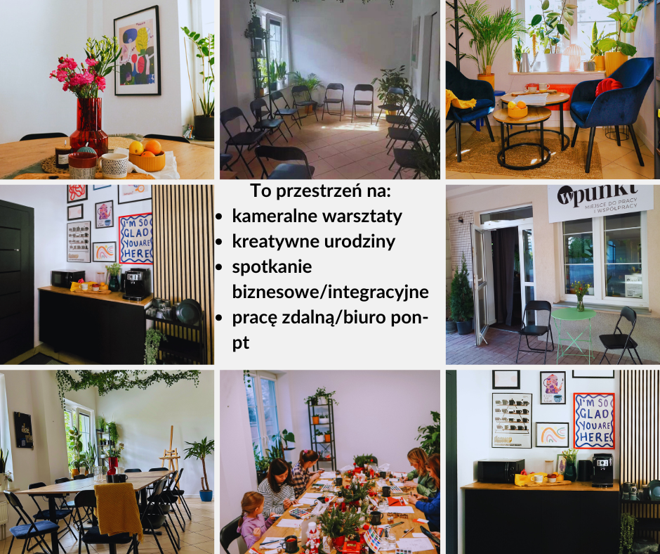 Oferujemy do wynajęcia komfortową i funkcjonalną przestrzeń idealną na warsztaty, szkolenia, spotkania biznesowe i prywatne oraz sesje indywidualne (np. coaching, terapia).